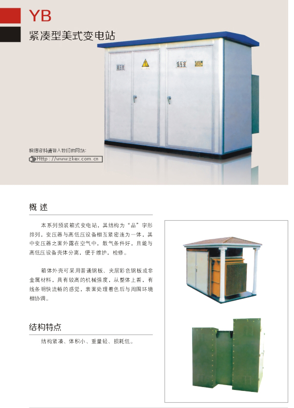 本系列預(yù)裝箱式變電站,其結(jié)構(gòu)為“品”字形.排列,變壓器與高低壓設(shè)備相互緊密連為一體,其中變壓器之面外露在空氣中,散氣條件好,且能與高低壓設(shè)備殼體分離,便于維護(hù),檢修。箱體外殼可采用普通鋼板、夾層彩色鋼板或非金屬材料。具有較高的機(jī)械強(qiáng)度,從整體上看,有線條明快流暢的感覺,表面處理著色后與周圍環(huán)境相協(xié)調(diào)。