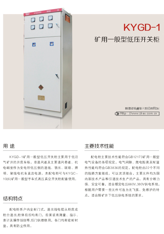 KYGD-1礦用一般型低壓開關(guān)柜主要用于低沼氣礦井的井底車場,總進(jìn)風(fēng)道及主要進(jìn)風(fēng)巷道、機(jī)電峒室作為變電所低壓側(cè)的進(jìn)線、饋出、聯(lián)絡(luò)、照明、架線電機(jī)車直流電源。本配電柜可與KYGC-10(6)礦用-般型手車式高壓真空開關(guān)柜配套使用。